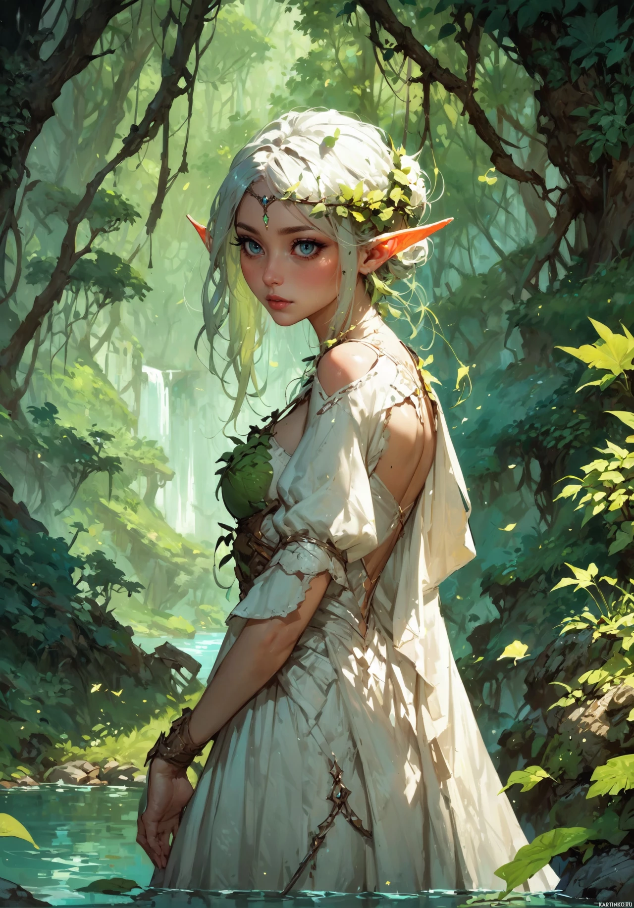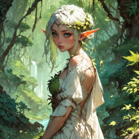 white hair and is adorned with various fantasy-themed elements, such as leaves in her hair and what seems to be a magical or enchanted staff by her side. She's standing in a forest setting with