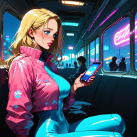 a female character with blonde hair looking at her phone. She is wearing a pink jacket and