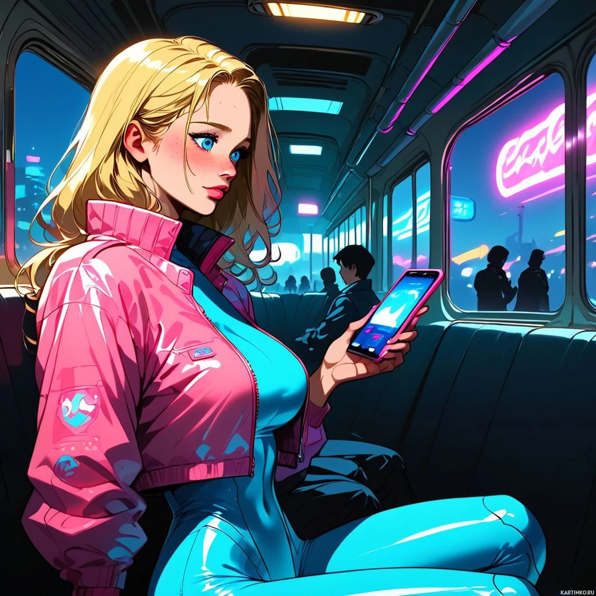 street scene at night, with the interior of a bus visible, indicating that she might be sitting on one of the seats inside the bus. The character's expression is contemplative or possibly bored as she engages with her phone.