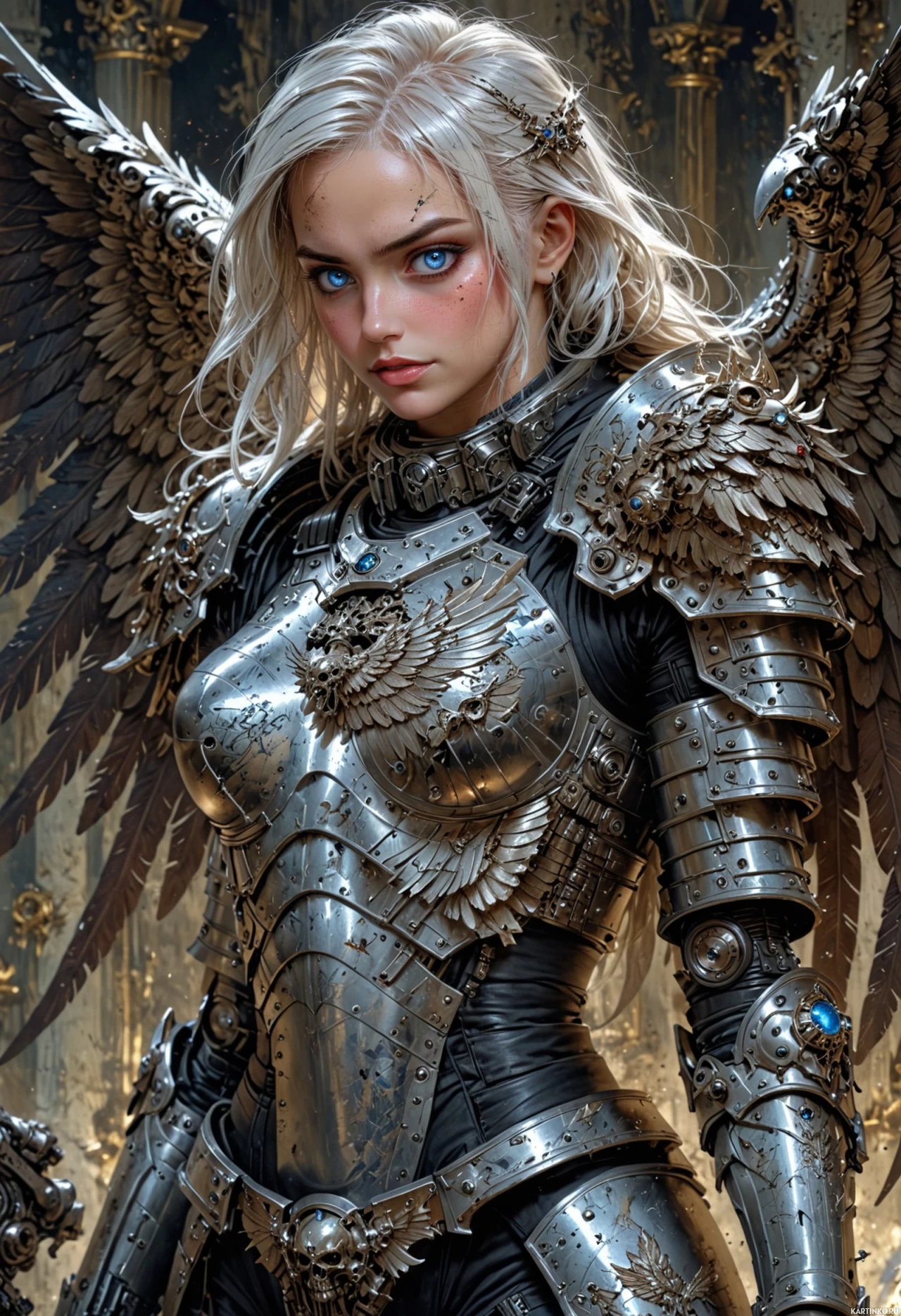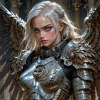 На картинке изображена юная девушка с белыми волосами в фантастическом мире. У неё большие чёрные крылья, расправленные от плеч. На ней облегающая серебряная броня, украшенная синими камнями и сложным орнаментом. Броня включает в себя наплечники и перчатки, что придает ей вид воительницы. Она стоит на фоне тёмного звёздного неба и классического архитектурного элемента, похожего на арку или портал.
