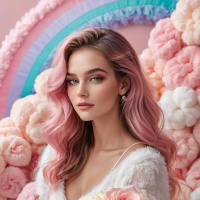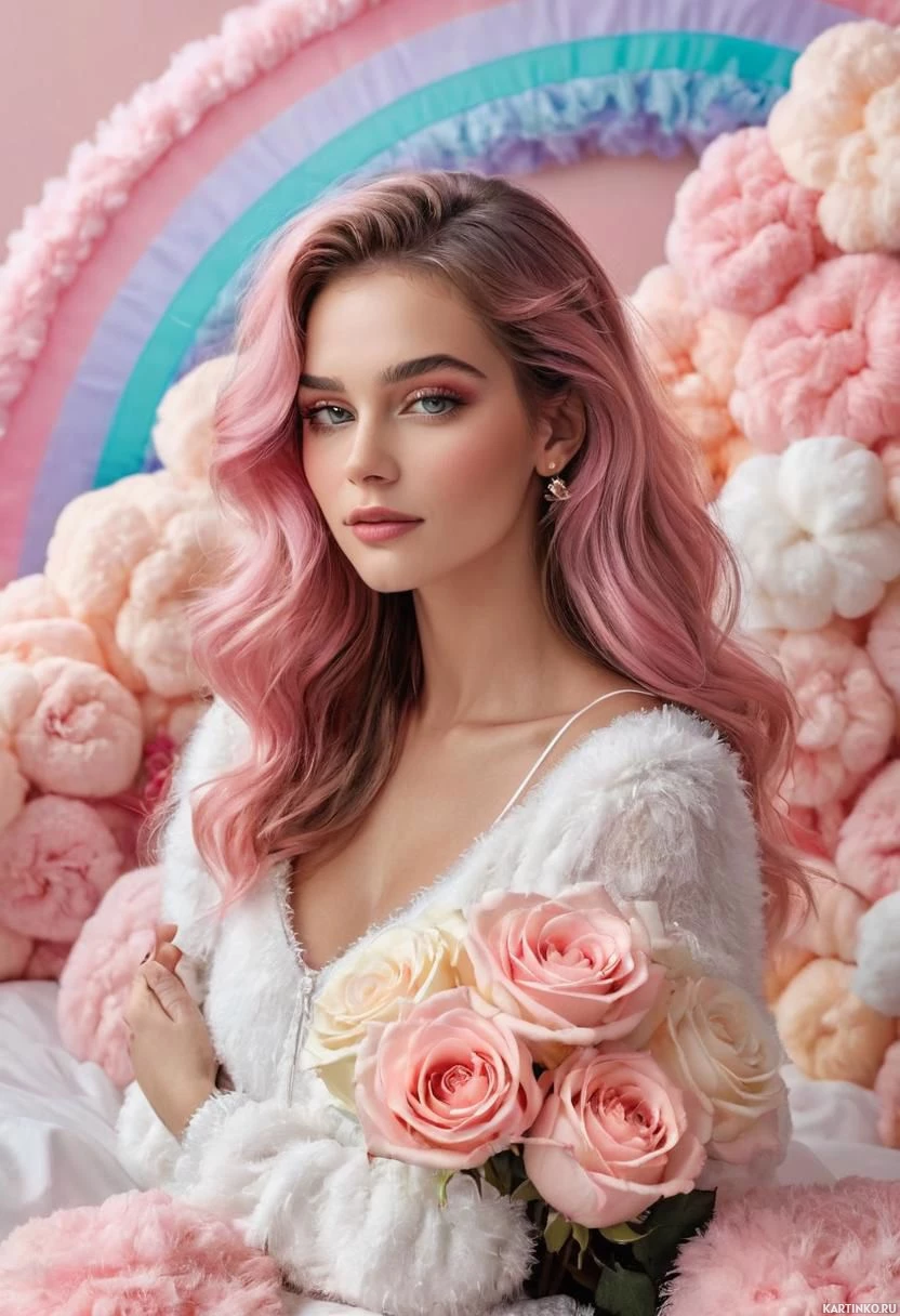 the glamorous look. In the background, there is an array of colorful fluffy fabric pieces arranged in a circular fashion, resembling a cloud-like formation. The overall tone of the image is soft and feminine with