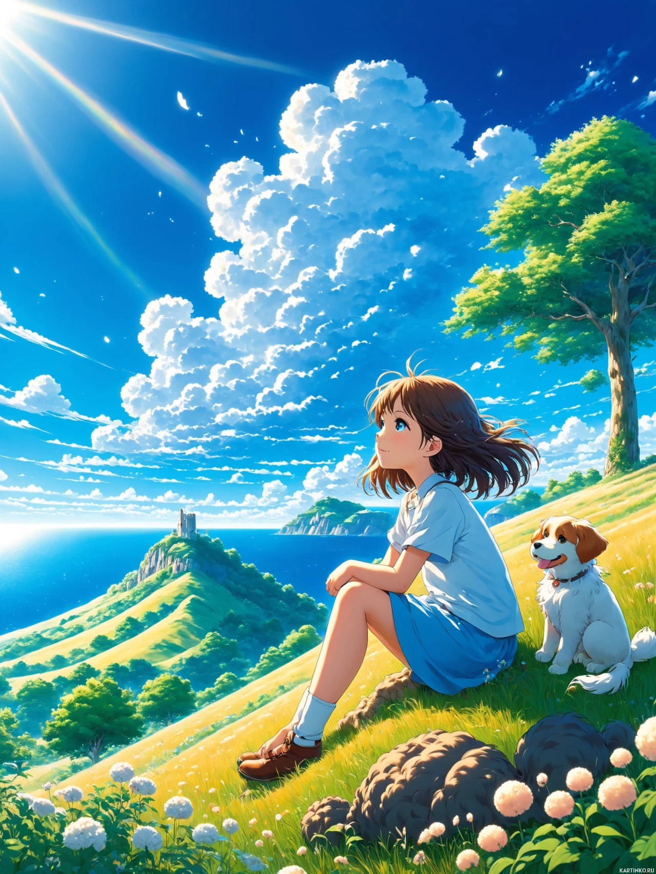 the simple joy of spending time outdoors with a pet. The anime style is evident in the character designs, particularly the girl's large expressive eyes that are characteristic of this animation genre.