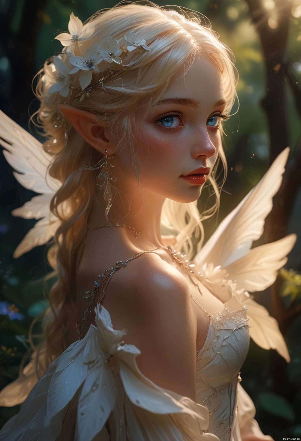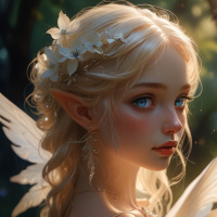 fair skin. Her wings are visible behind her back, and she is wearing what appears to be a fantasy-style costume or armor adorned with feathers and other ornaments. The setting is a lush,