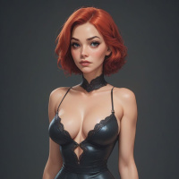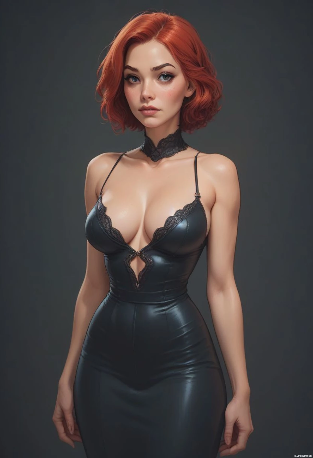 На картинке изображена девушка с рыжими волосами и светлой кожей. На ней черное кожаное платье с глубоким вырезом и кружевной отделкой на лифе. Вокруг шеи у нее чокер. Вся картинка выдержана в стиле, который может намекать на моду, косплей или концепт-арт.