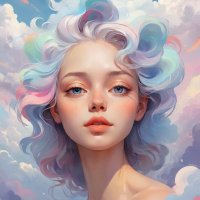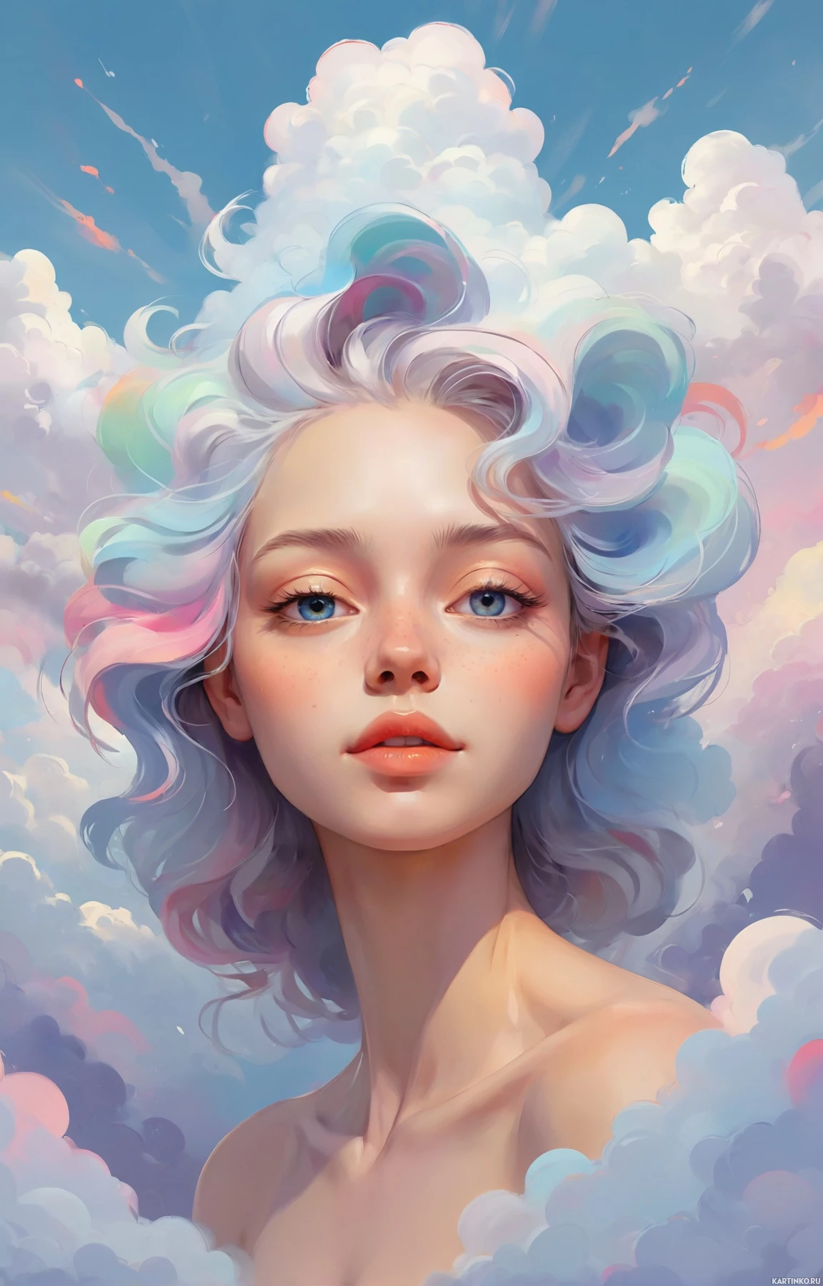 На картинке представлен стилизованный цифровой арт с профилем девушки. У неё короткие волнистые волосы с пастельными прядями и макияж, подчеркивающий глаза и губы. Выражение лица нейтральное. На голове — пышная масса пастельных волос, напоминающая бигуди, что создает впечатление яркой и игривой прически. Фон состоит из облаков с пробивающимися лучами солнца, создавая неземную атмосферу.