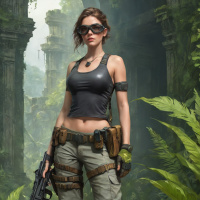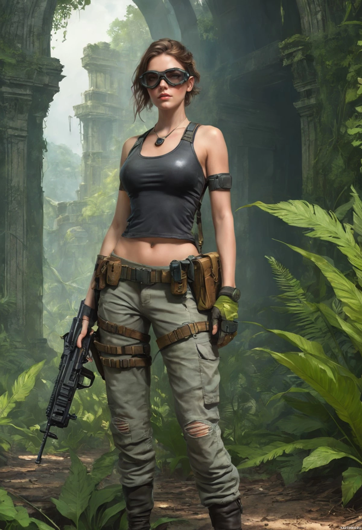 a tank top, cargo pants, and combat boots. She wears sunglasses and has a visible handgun holstered on her hip. Her pose is confident, with one hand resting on her hip and the other gripping the handle of the gun. The character's expression and attire suggest she might be portraying a role as
