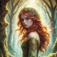 blue eyes, giving her an ethereal look. A crown of flowers adorns her head, suggesting she might be a princess or royalty within