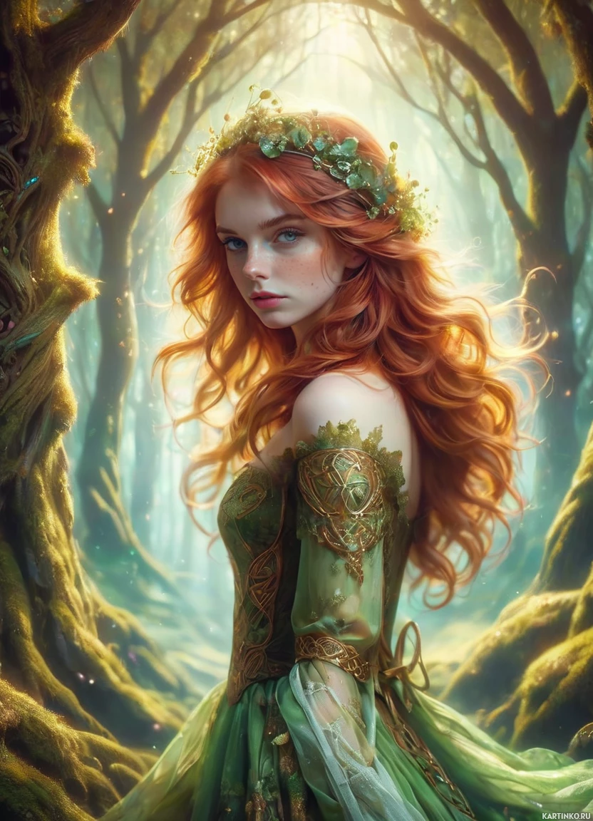 red hair and is wearing what appears to be an elegant green dress with golden embroidery. The character has fair skin and striking