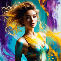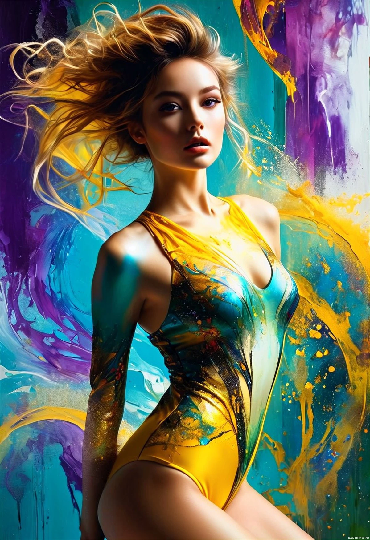 a blonde woman with paint splatters on her body, wearing a vibrant, colorful swimsuit. She is standing confidently against a backdrop of dynamic and colorful