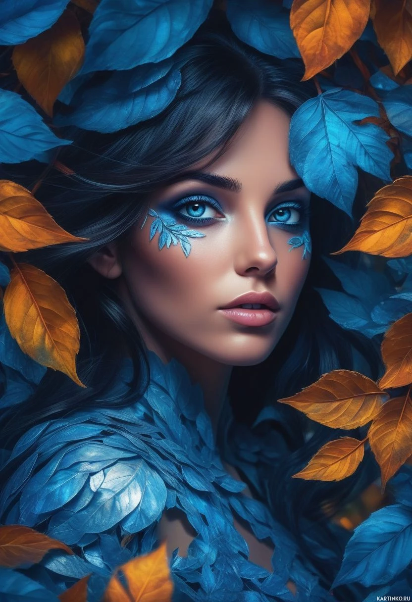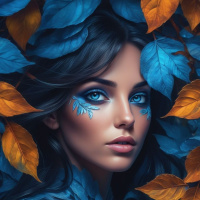 fair skin and is adorned with what appears to be feathers or petals painted in various shades of blue, yellow, and white, creating an intricate pattern around her neck and shoulders. These elements give the impression that she is made up of leaves, which could be symbolic of nature or transformation. Her expression is serene and contemplative, looking directly at the viewer with a subtle hint of a smile on her lips. The background is softly blurred, allowing the focus to remain on the central figure. Overall, the artwork is rich in detail and color, suggesting