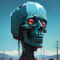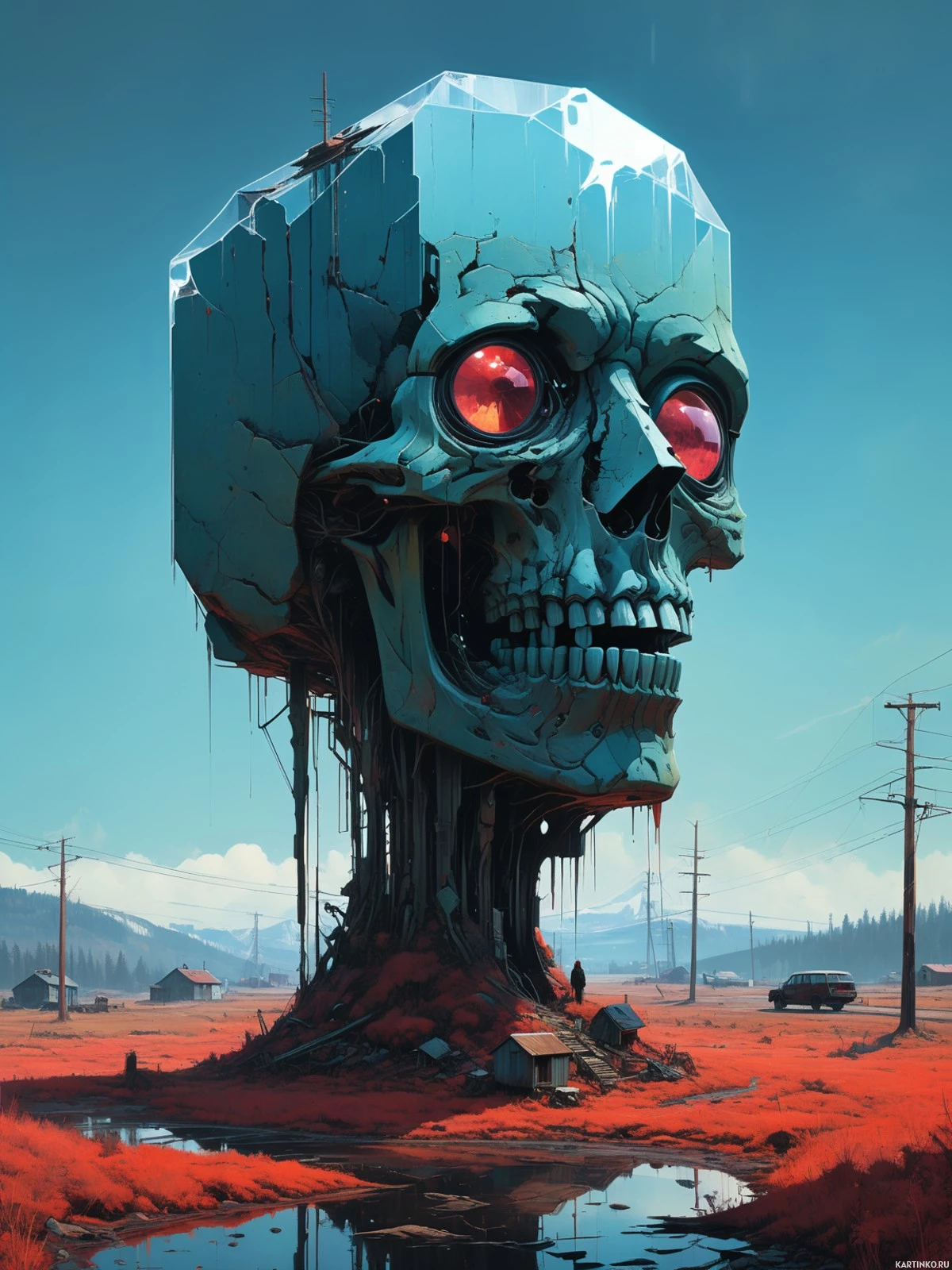 The image features a large, disproportionately sized skull atop a small headland. The skull has large
