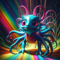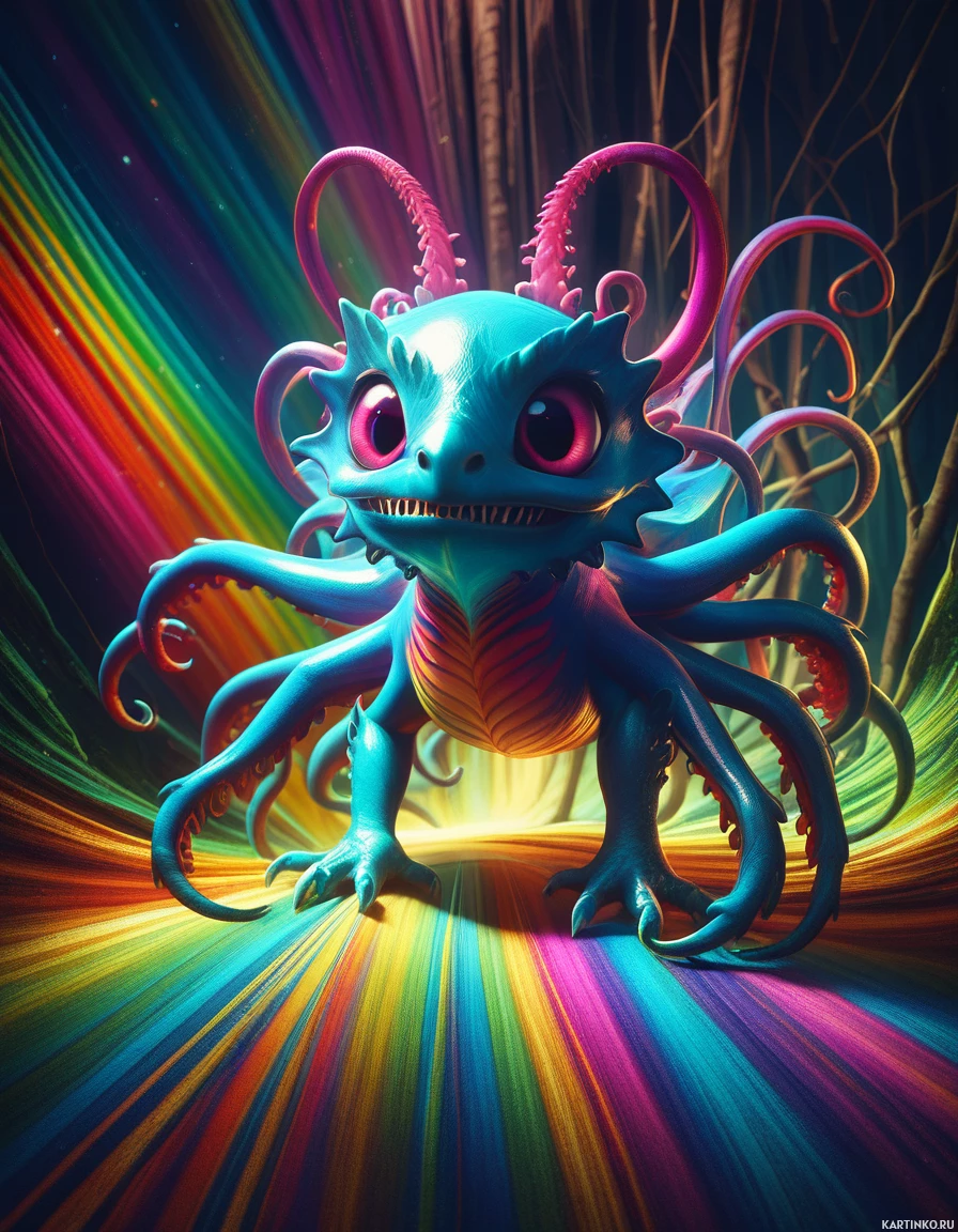 a fantasy creature resembling a dragon, with vibrant colors and dynamic patterns. It has a serpentine body, scales, and