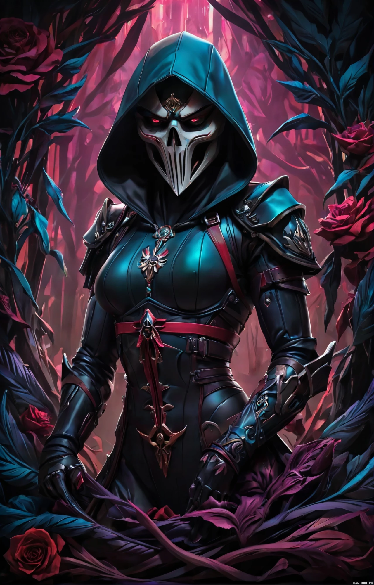 leather outfit and has a skull mask covering her face. Her attire includes
