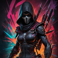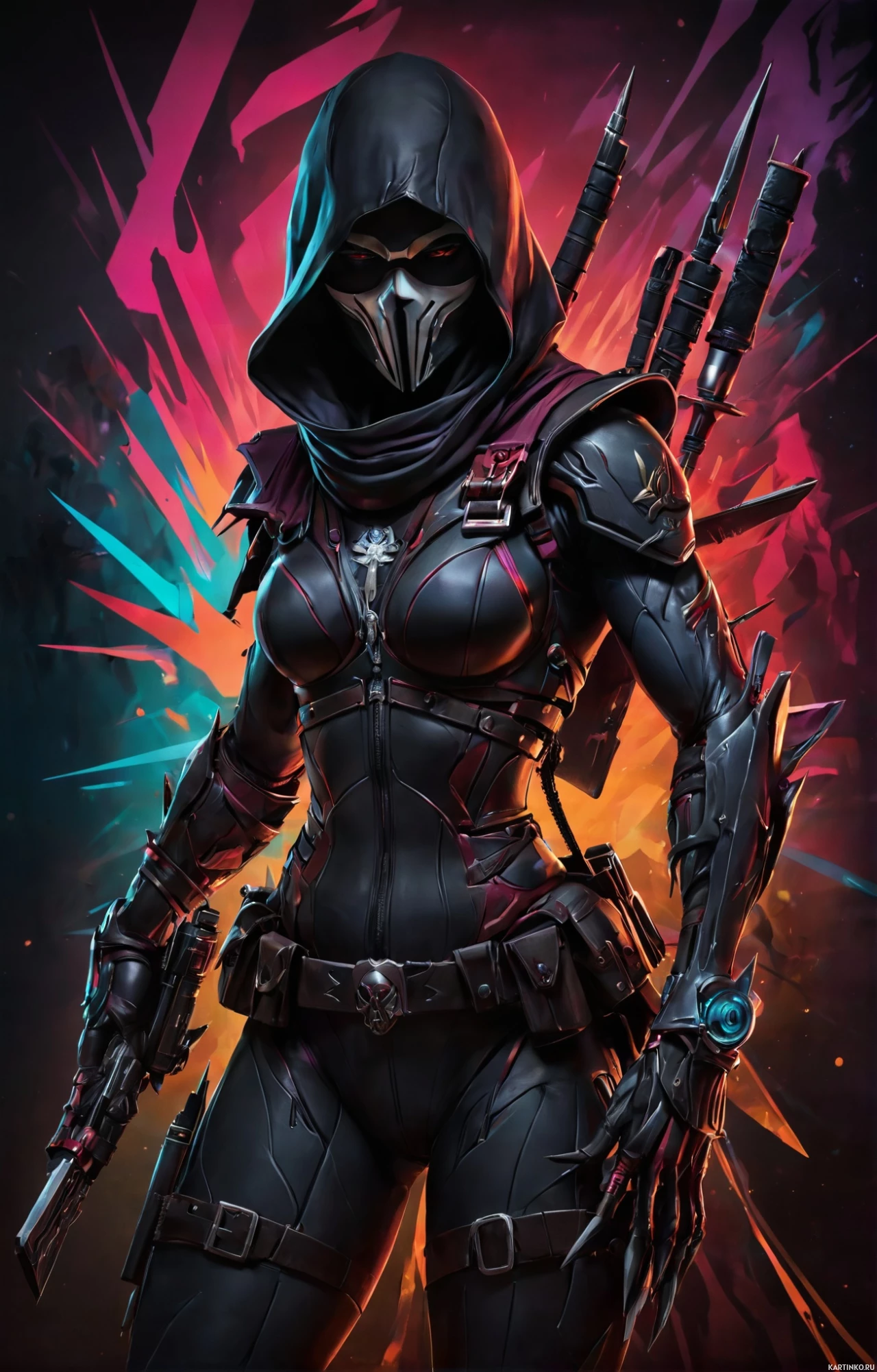 The image features a character wearing a mask with skull-like features and a hood, giving off an intimidating appearance. She has