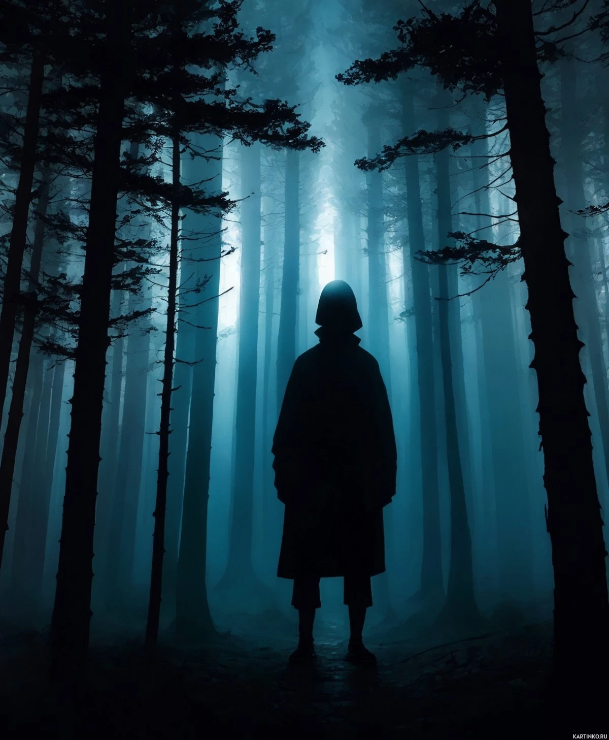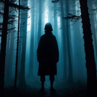 dark clothing and has their hood up, obscuring the features of the face. They are facing away from the viewer, looking towards a point off-frame where light seems to shine through the trees, creating