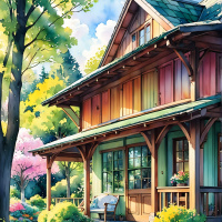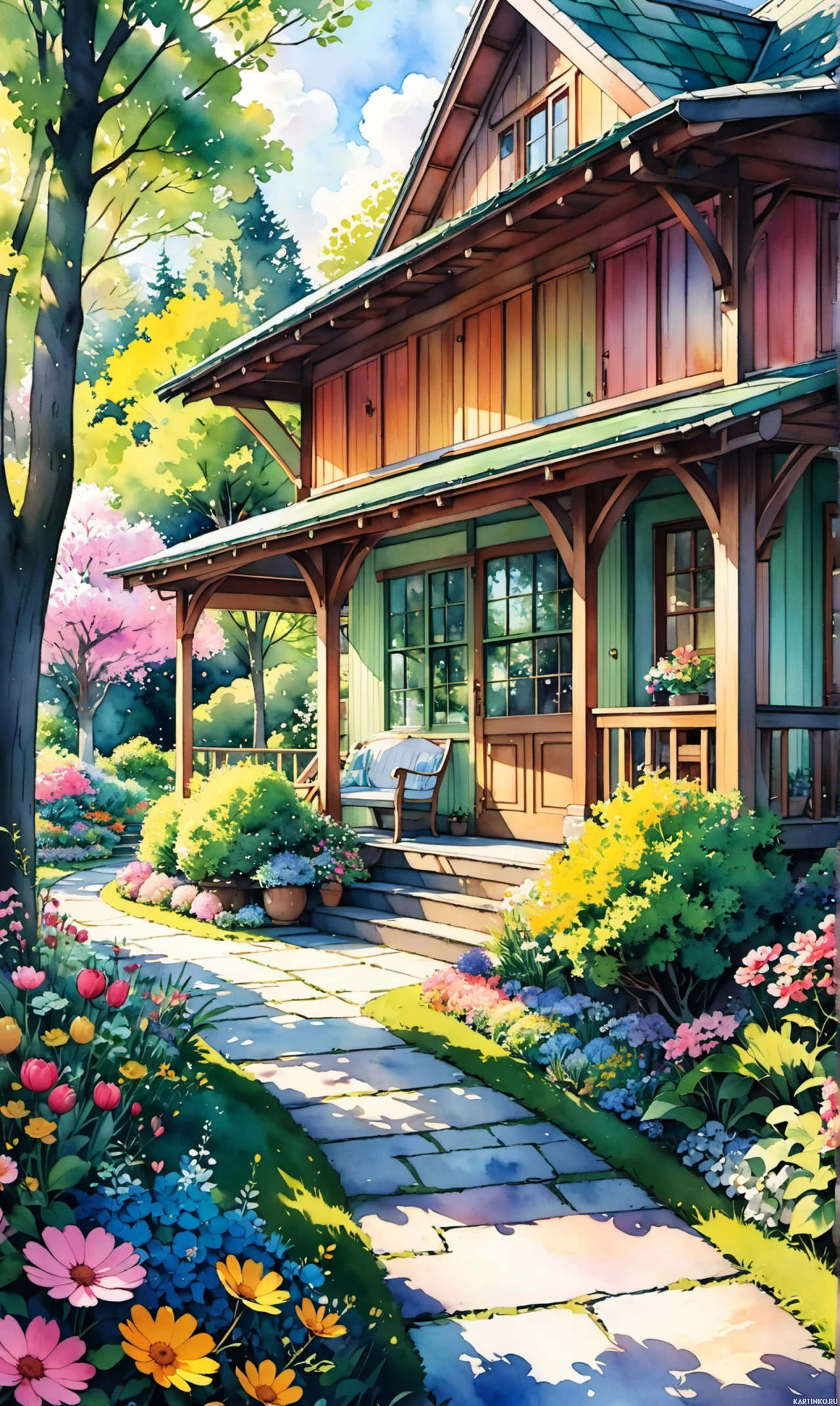 a picturesque house nestled in a landscape. The architecture of the home suggests it's a quaint, possibly mountain-style dwelling with a prominent
