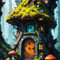 the base of the tree leads into a room with a mushroom on the roof, and it's adorned with various decorative elements like leaves and vines. The colors are vibrant and cheerful, with the house itself being green with yellow accents. The artwork is detailed and evokes a sense of wonder and fantasy, likely appealing to viewers who enjoy stories or illustrations in this genre.