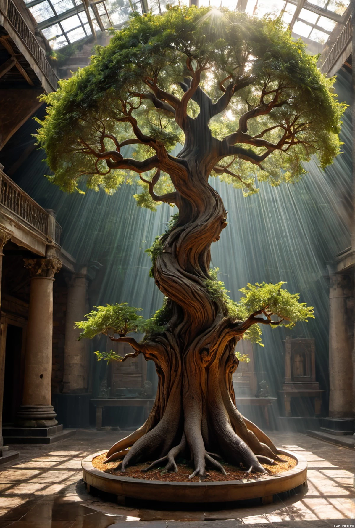 an interior space, possibly a museum or exhibition hall, with classical architectural elements such as pillars and arches. Dominating the scene is a large tree sculpture with