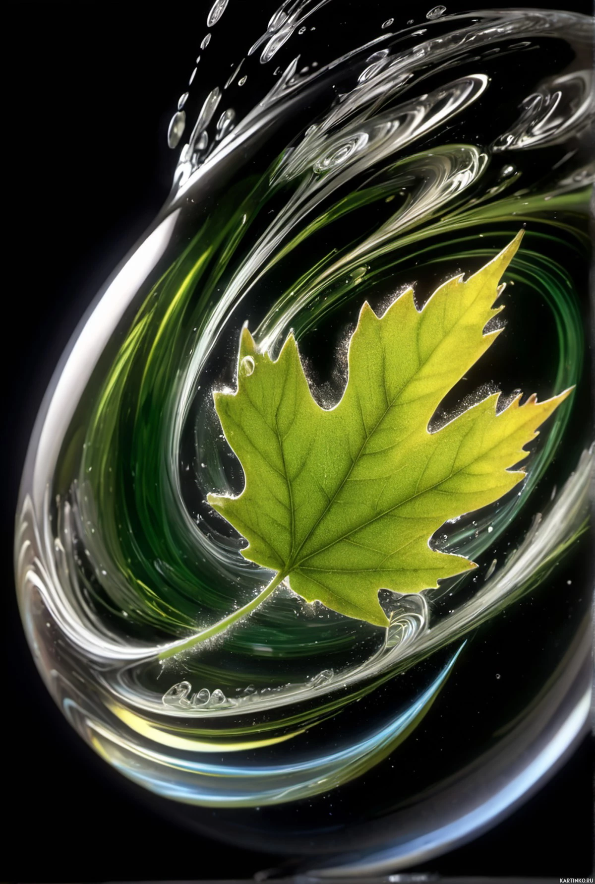 green color with distinct veins that give it its natural texture. It appears to be in the process of shedding or floating downwards. The background consists of concentric circles creating