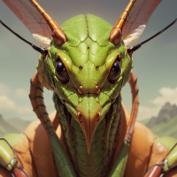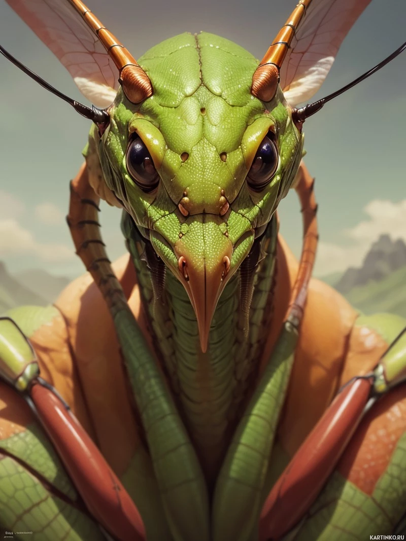 a serene landscape that looks like a mountainous region with verdant greenery. The background gives the impression of a calm, peaceful environment which contrasts with the creature's imposing presence. The image is rich in detail and suggests a blend of fantasy and science fiction elements, creating a unique character design that could be found in speculative or imaginative narratives set within such genres.