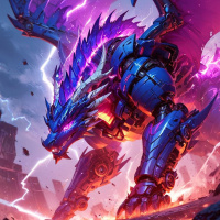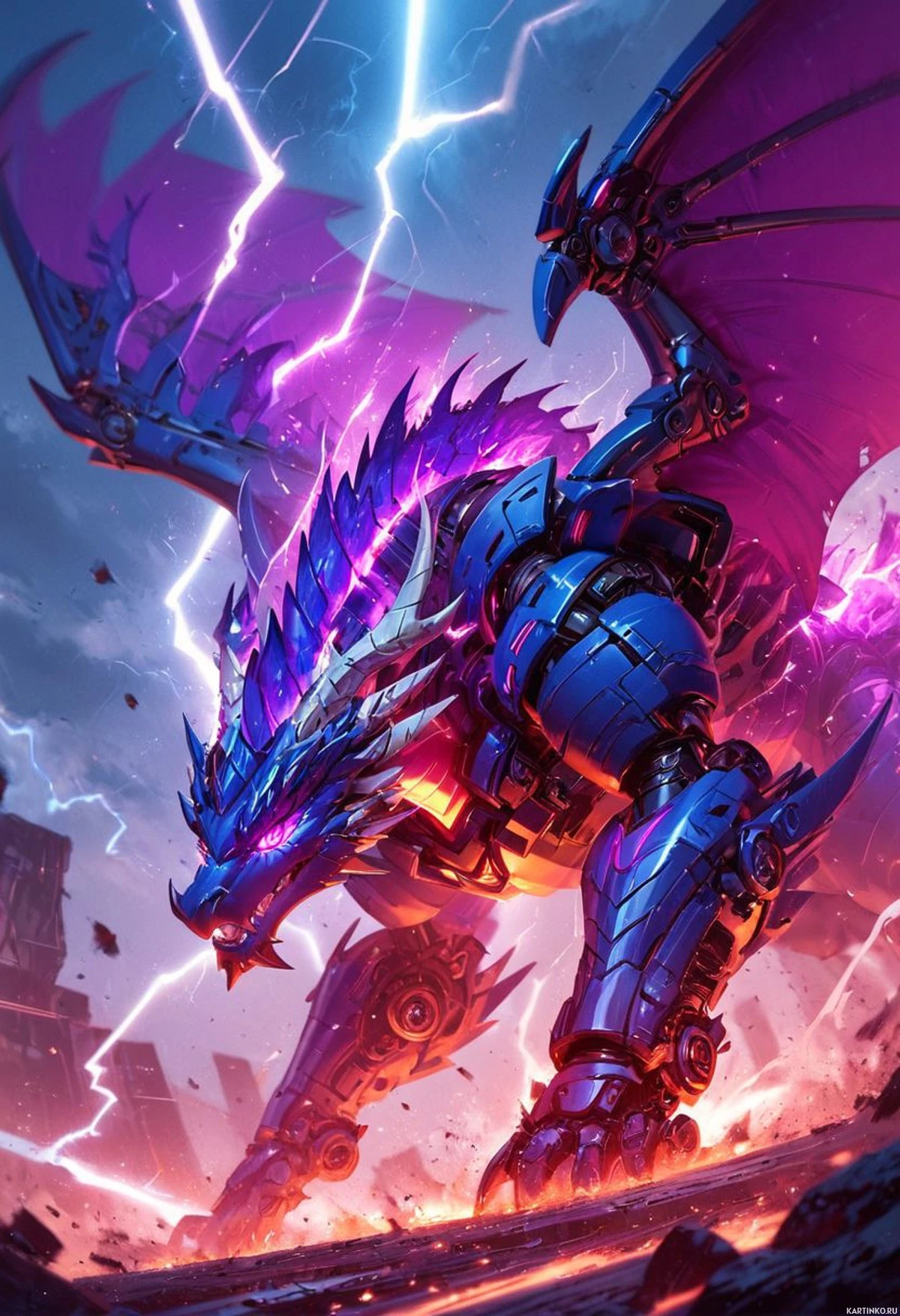 a mythical creature, complete with large wings and an intimidating expression. It is set against a backdrop that suggests chaos or battle, possibly due to the explosive elements and dynamic