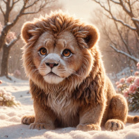 pink flowers peeking through the snow, adding a touch of color to the otherwise monochromatic landscape. The overall mood of the image is serene and somewhat wistful due to the combination of the lion's gaze and