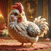 framed portrait hanging on the wall, and below it stands an ornate wooden cabinet. To the left of the chicken is a table set with a variety of items including what appears to be eggs, perhaps indicating a domestic or farm setting. The overall style of the image suggests that this could be a digital artwork or a still from