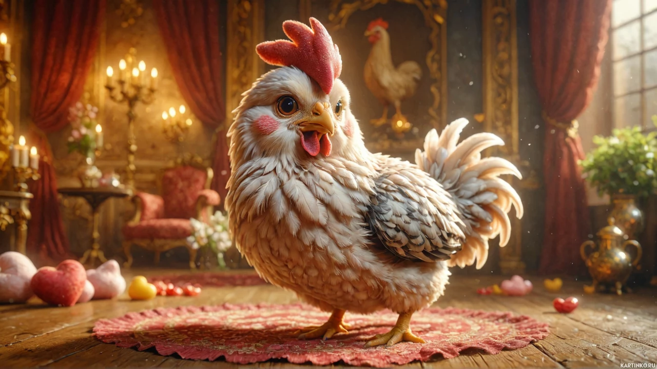 a curious expression. The room around the chicken is lavishly furnished with antique decorations. There are red curtains framing the window, which allows