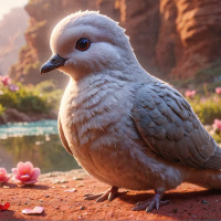 an illustrated bird, likely a dove or similar species, perched on a rock with its wings neatly folded. The bird is facing away from the viewer and appears to be looking out over a serene landscape that includes a body of water resembling a lake, surrounded by a lush desert environment with scattered