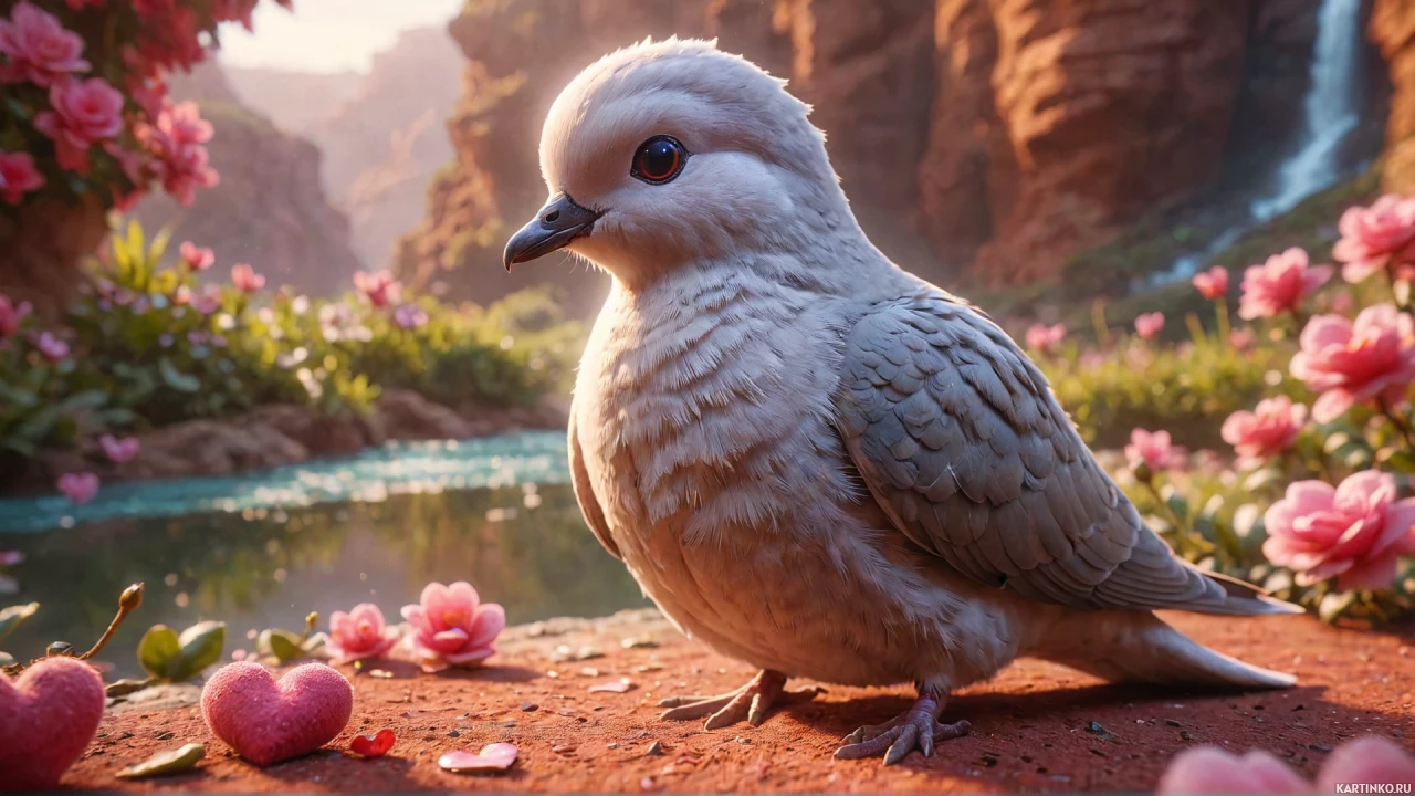 pink petals next to the bird on the rock, contributing to the overall tranquil atmosphere of the scene.