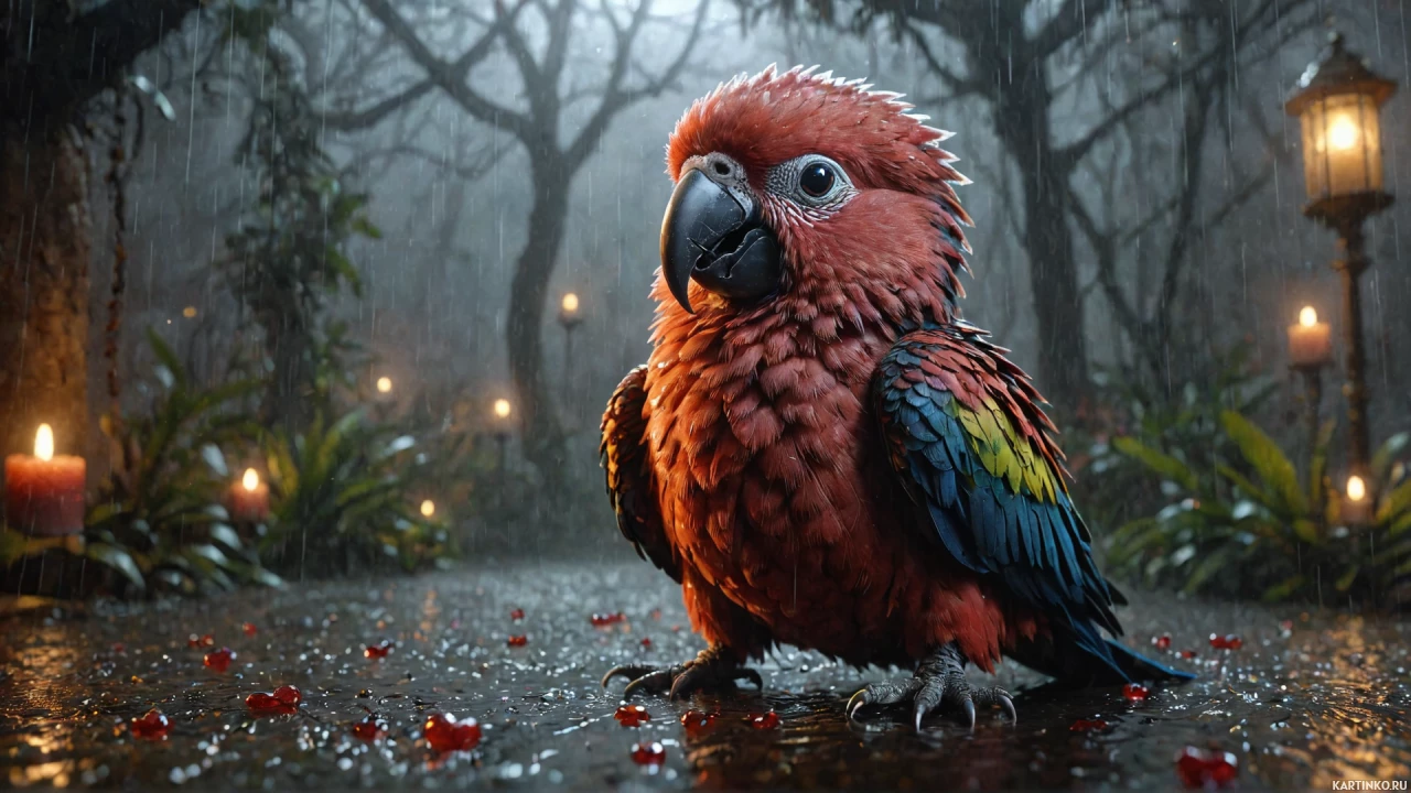 The image depicts a parrot standing on a rainy,