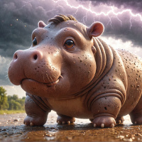 a natural environment with a hint of greenery and rocks along the water's edge. The hippo seems to be looking up at the sky, perhaps indicating concern or surprise about the impending