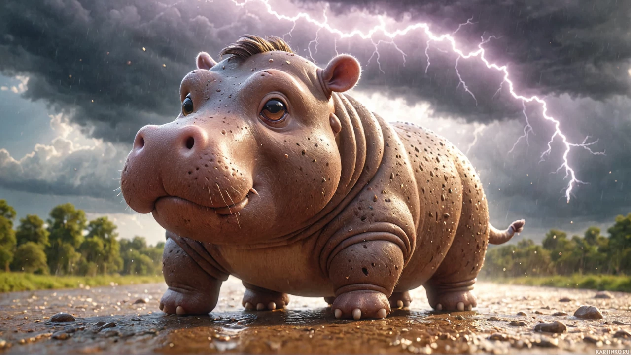 In the image, there is an animated hippopotamus standing in