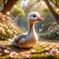 an animated scene featuring a duck. The duck is seated in the foreground, facing towards its right side. It has