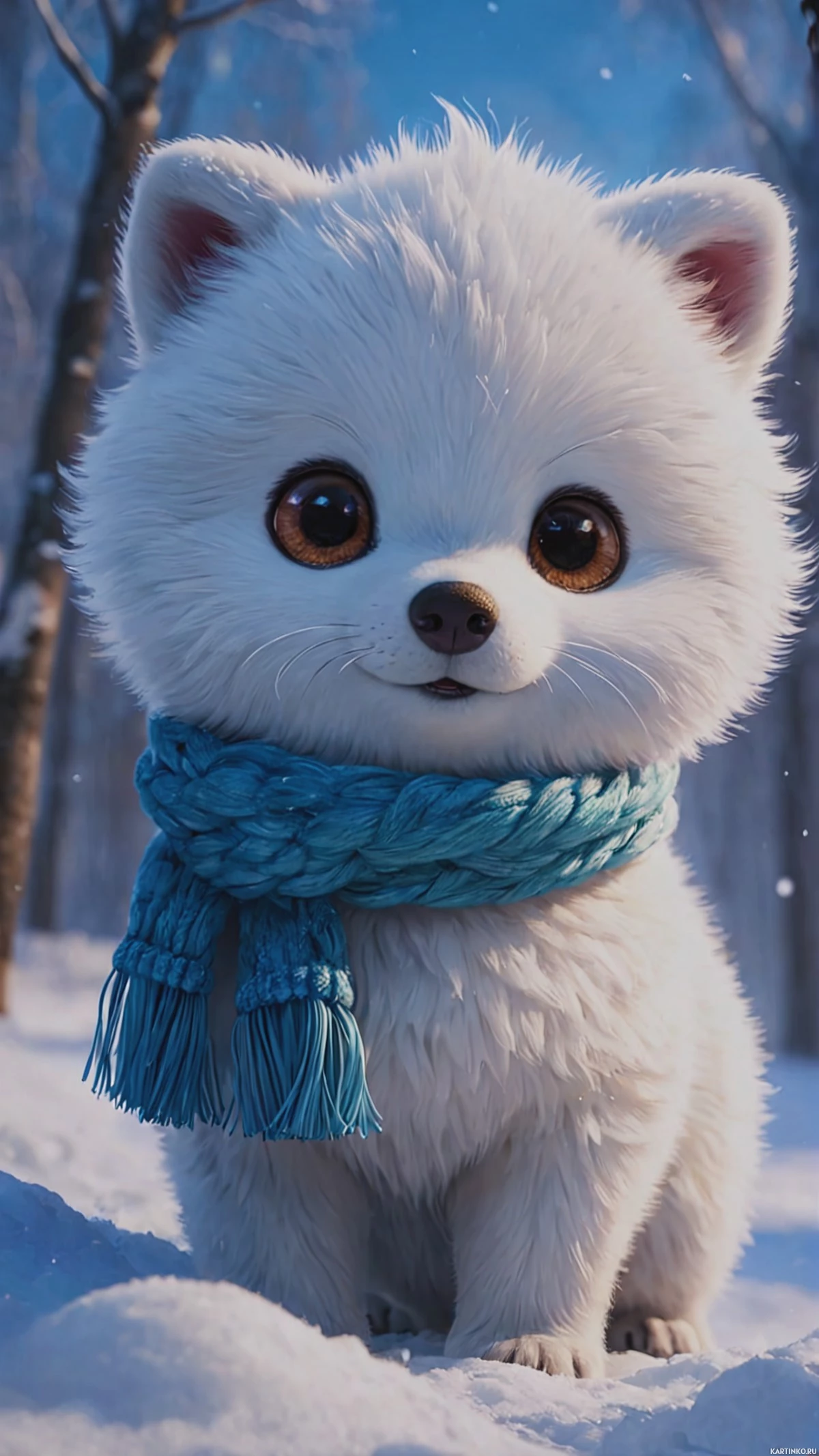 blue scarf around its neck, suggesting it may be cold or the image is meant to convey a sense of warmth or preparation for winter. There are no trees visible in this particular image, but there appears to be a hint of