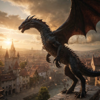 a fantasy scene featuring a dragon perched atop a castle wall. The dragon is shown in a highly detailed and realistic style, with scales that appear to be made of some sort of
