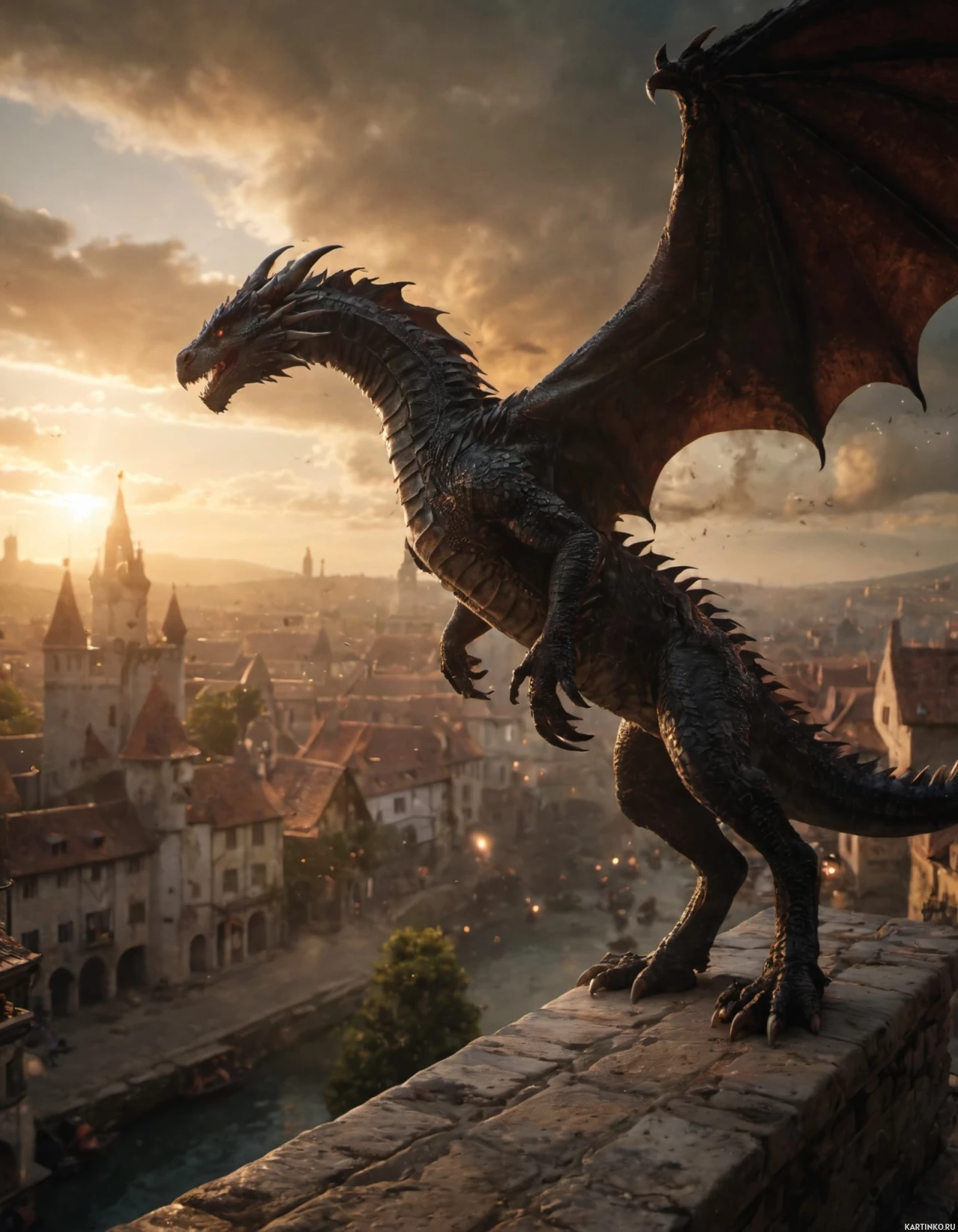 large wings spread out to its sides and a tail extending behind it. Its eyes are open wide, giving it an intense and alert appearance. The setting appears to be a stylized medieval village or town during either dawn or dusk, as the sky is illuminated with