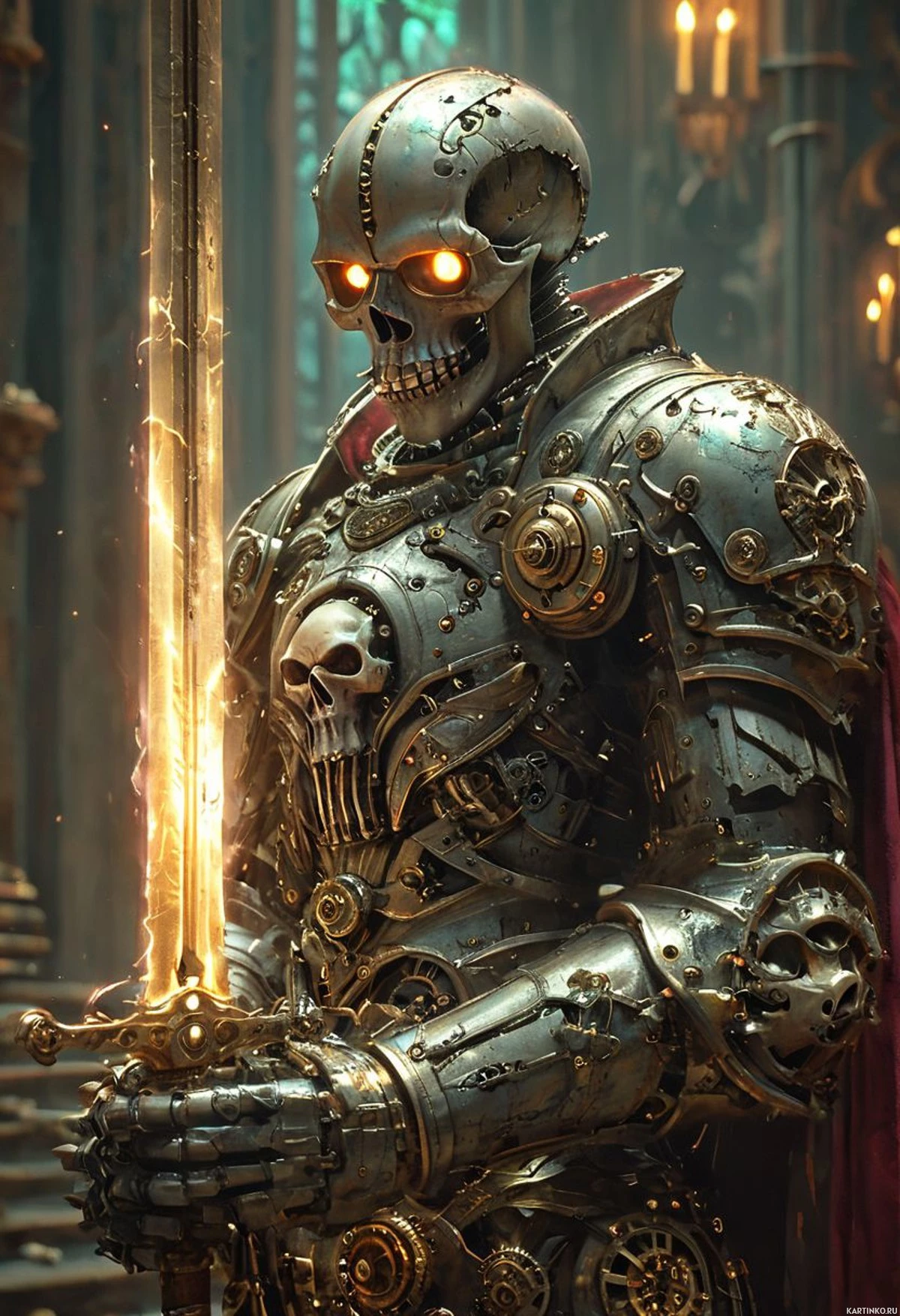 a formidable enemy or boss within the game. The setting appears to be a medieval or gothic environment, likely a castle or church given the architectural style and the presence of what looks like stained