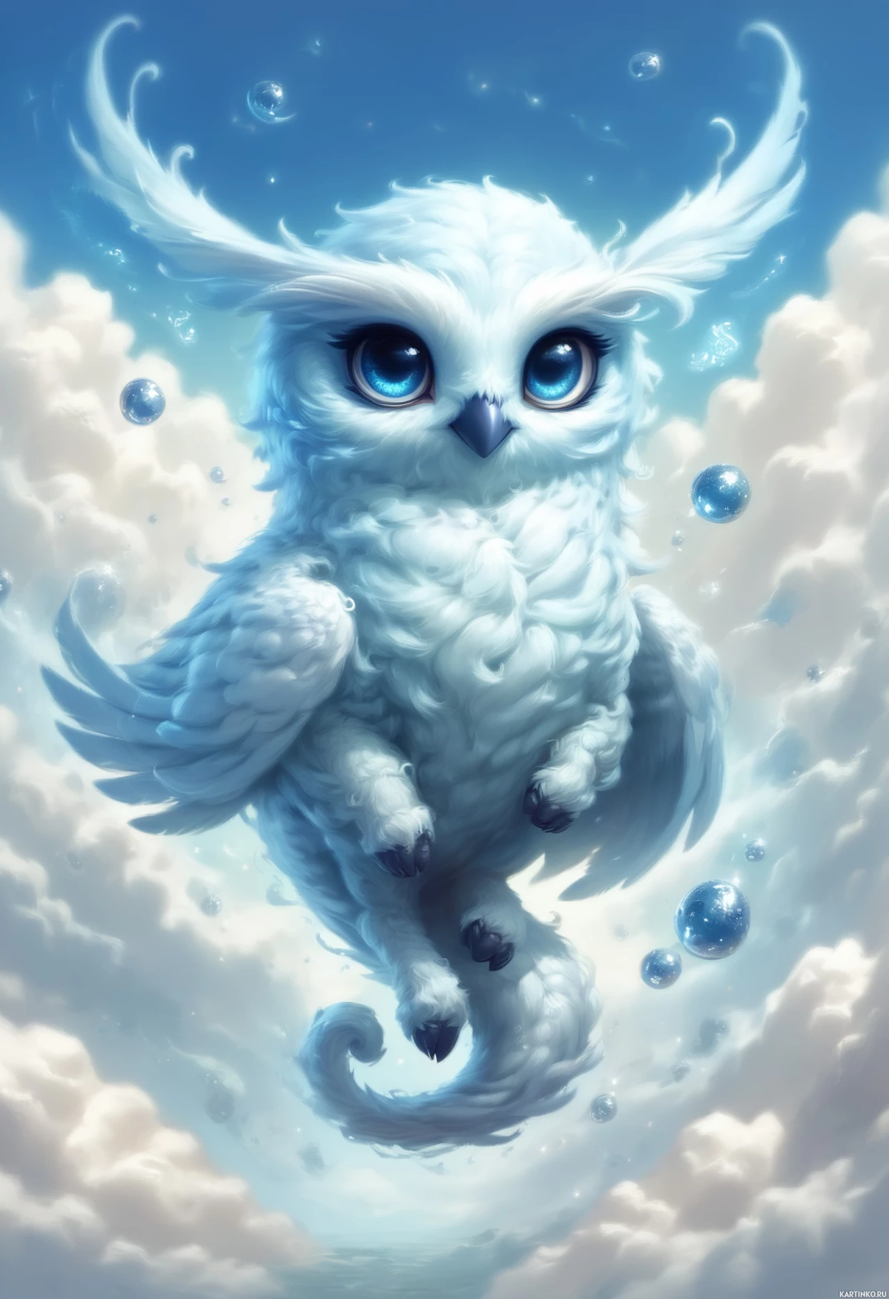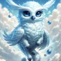 large wings and stands upright on two legs, resembling a humanoid owl character. The owl's feathers are white, giving it a fluffy appearance, and it has a small