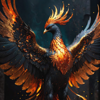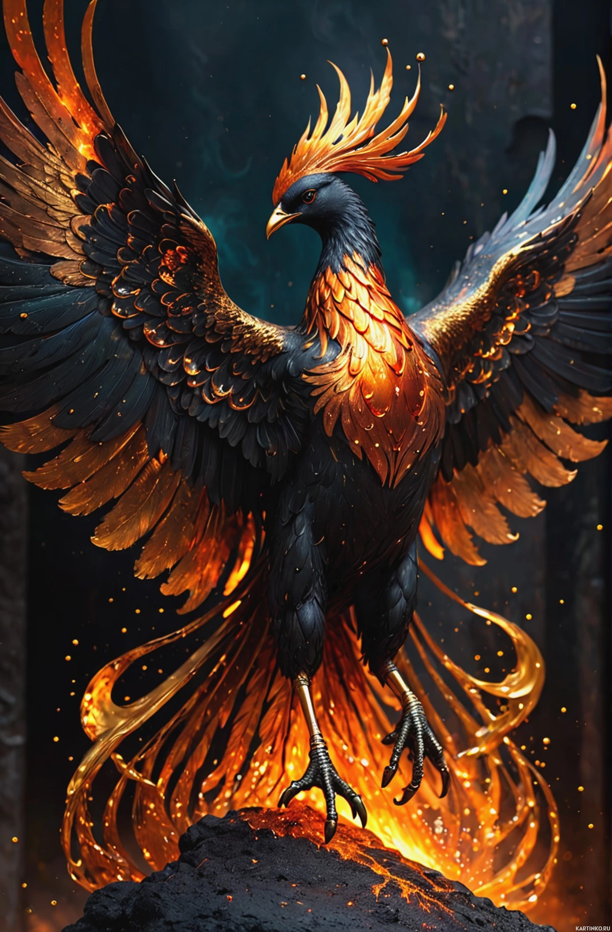orange feathers and a large wingspan. It stands confidently on a rock with flames emanating from its feet, enveloping the lower part of its body. In its beak, it holds a flame aloft as if it's casting light or magic. The background has an ominous feel, with dark