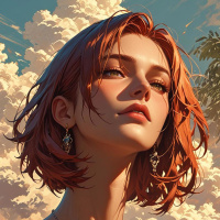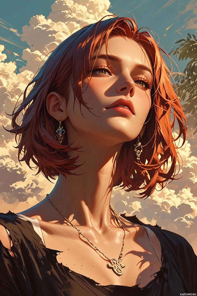 a young woman with red hair who appears to be looking away or towards something out of frame. She has a slender face and is wearing