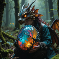 the forest setting of the image. The overall atmosphere of the picture is serene and mysterious, blending elements of nature with fantasy elements to create an intriguing visual narrative.