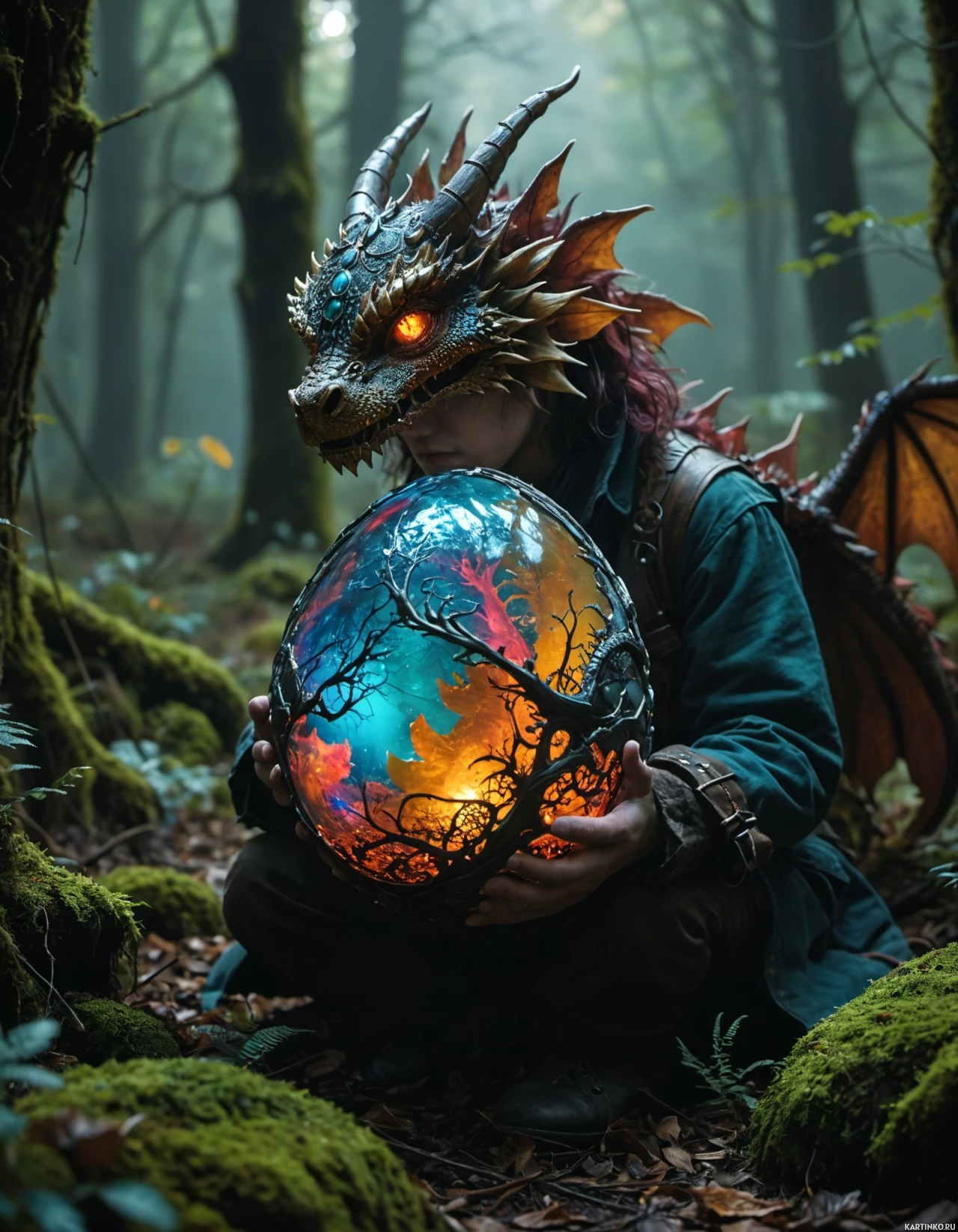 a forest floor, surrounded by natural elements such as moss and lichen-covered rocks. In its hands, the creature holds a spherical object that displays scenes of sunset and