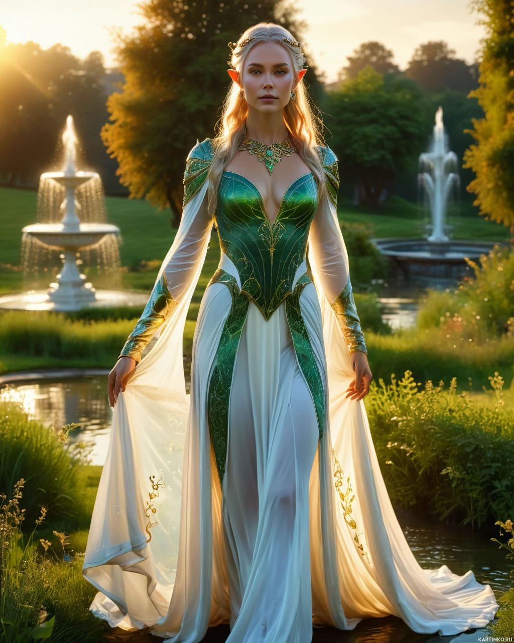 blonde hair and is wearing a dress with long, flowing fabric that could suggest she's portraying an elf character. Her makeup and the styling of her hair contribute to the overall fantasy theme. In the background, there's a pond or