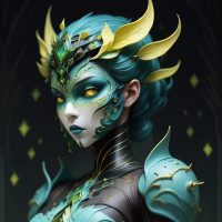 gold accents. On her shoulders, there are what look like armored pieces, which give her an imposing presence. There are also details that suggest a fantasy or otherworldly theme to her attire, such as what appears to be a scale texture in the fabric of her clothing. The background is neutral and does not distract from the central figure of the illustration. The overall style of the image suggests it could be from a video game or a fantasy art collection, with particular attention given to the character's detailed makeup and costume design.