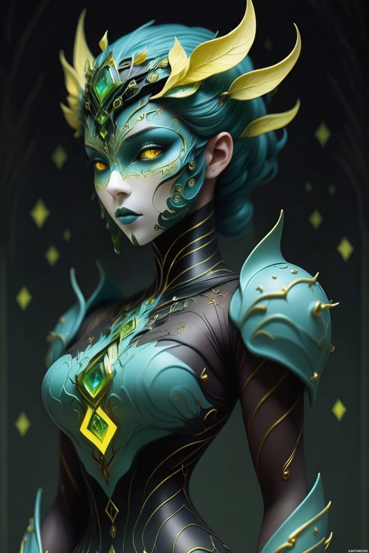 an illustrated character who appears to be a girl with turquoise hair. She has a face that is drawn with detailed features, including eyes with slit-like pupils and lips that are subtly parted. Her skin tone is pale, which contrasts with