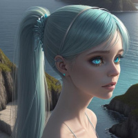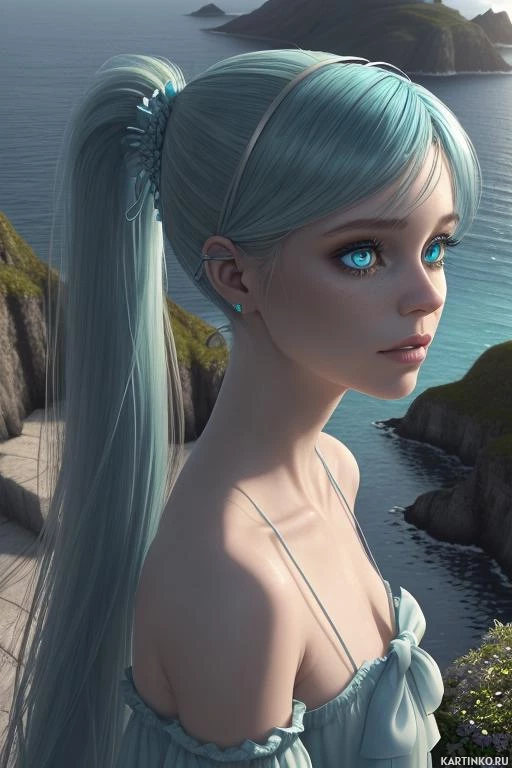 a body of water, possibly the sea, which can be seen in the distance along with greenery and rocks on either side. The character is dressed in a light-colored outfit that has some lace or ruffled detailing around the collar and sleeves. The style of the artwork leans towards realism, especially in the rendering of the skin and hair textures, but it also incorporates some stylized elements such as exaggerated features like her lips and eyes.