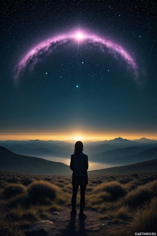 a high elevation or during a time when skies are clear and dark. Below the person, we see the outlines of mountains and rolling hills, providing