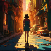 a young girl who appears to be walking down a street lined with old cars. The setting suggests