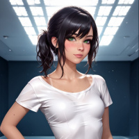 a young woman standing in what appears to be an indoor setting with reflective surfaces. She has short